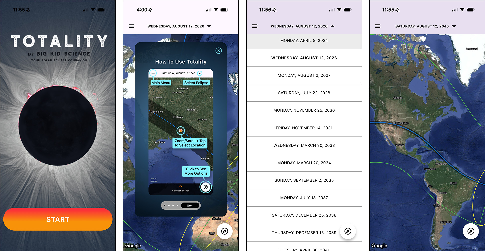 Put recent and upcoming total solar eclipses in your pocket with Totality by Big Kid Science, available FREE for iOS and Android smartphones! Totality is sponsored by the American Astronomical Society and includes the following features, among others: